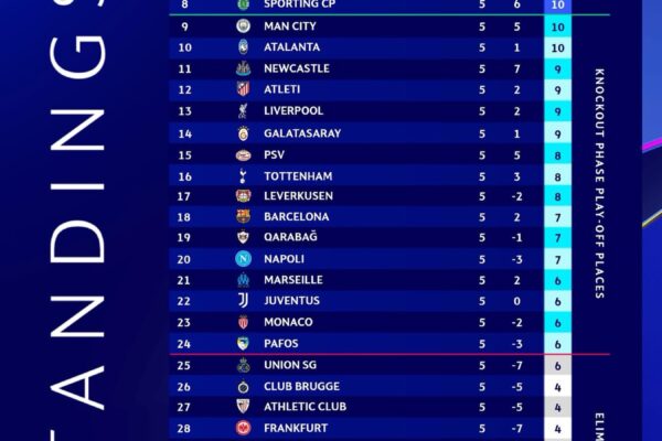 Concluida la fecha 5 de la fase de Liga de la Champions, el Arsenal es líder en solitario, seguido de PSG, Bayern, Inter y Real Madrid.