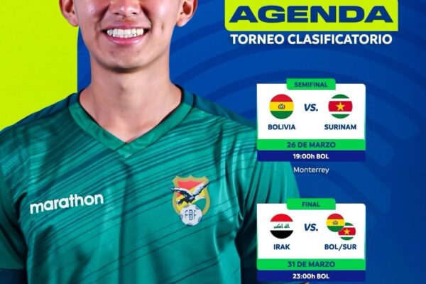 La Selección Boliviana jugará con Surinam el 26 de marzo (19:00) en las semifinales del repechaje para el Mundial 2026 y de ganar enfrentará a Irak el 31 de marzo (23:00) en las finales, confirmó el domingo la Conmebol.Los partidos están programados en la ciudad de Monterrey, México.