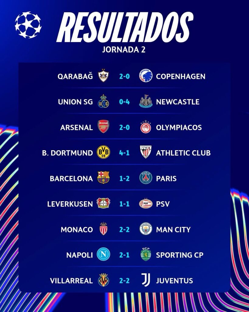 Así quedaron los otros 9 partidos de la segunda jornada de la fase de grupos de la Champions, el gran golpe lo dio el PSG al ganarle en su casa al Batcelona.