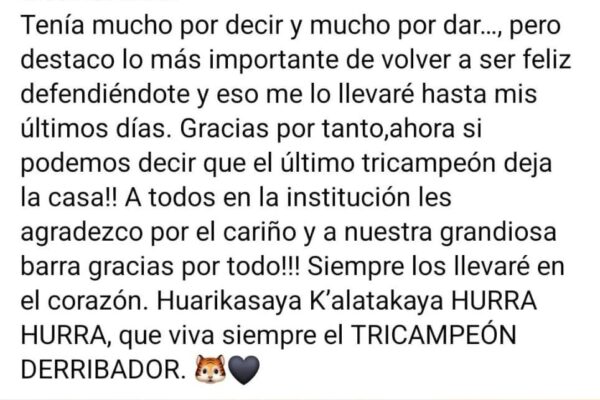 Con un video y un emotivo mensaje en sus redes sociales , Rodrigo Ramallo se despidió de The Strongest: «Gracias por haberme dado una última oportunidad de defenderte mi viejo tigre. He intentado devolverte tantas alegrías y momentos que me hiciste vivir con mucha intensidad, pero así como todo en la vida, todo tiene un…