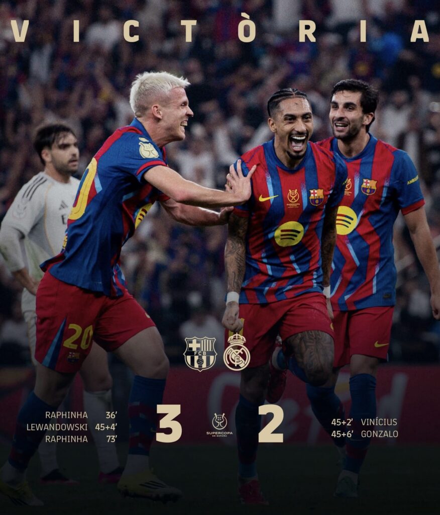 El Barcelona se proclamó campeón de la Supercopa de España tras vencer al Real Madrid por 3-2 en un partido vibrante disputado en Yedá, Arabia Saudita.