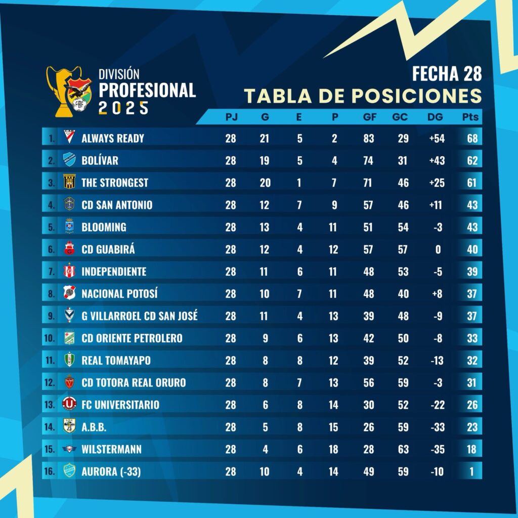 El lunes terminó de jugarse la fecha 28, Always Ready sigue liderando y solo le restaría sumar un punto en 2 fechas para consagrarse campeón. Lo sigue Bolívar que solo aspira a que el líder no sume ni un punto más y ganando sus dos encuentros, forzar a un desempate, algo que es poco probable que suceda.