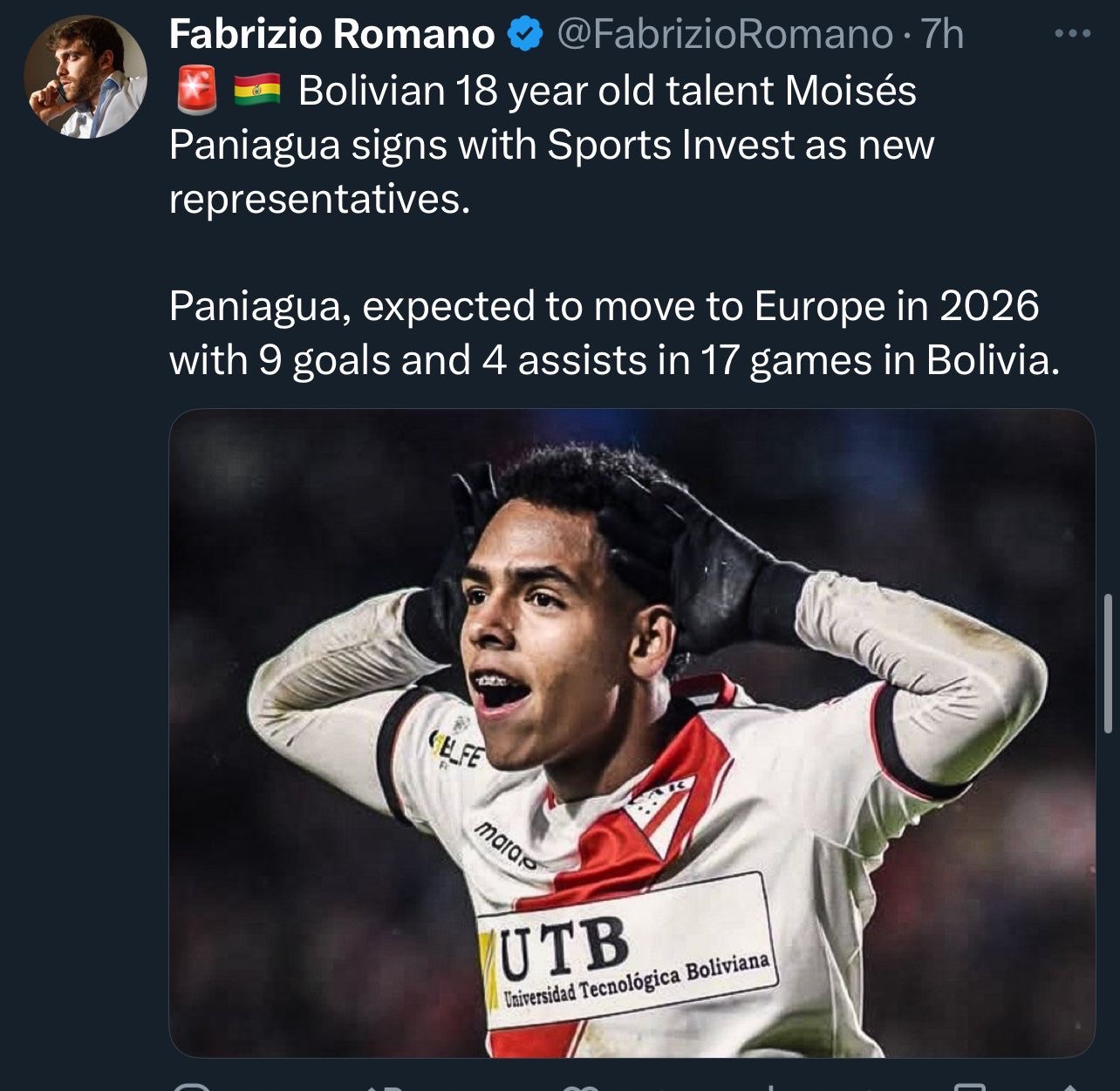 Según el conocido periodista Fabricio Romano, «el talentoso boliviano de 18 años Moisés Paniagua firma con Sports Invest como nuevos representantes.
