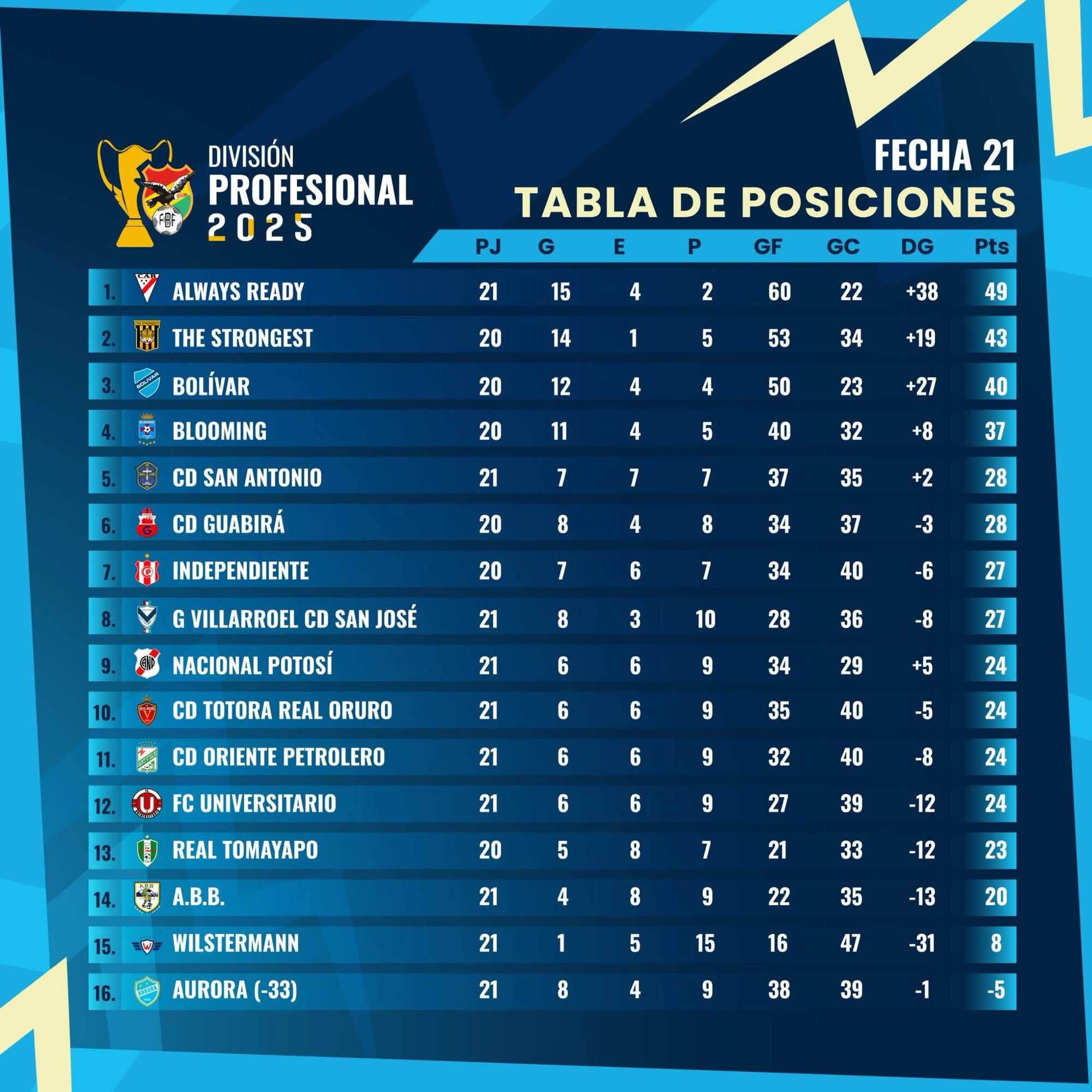 Concluida la fecha 21 del torneo largo o Liga, Always Ready se afianza en la punta, seguido de The Strongest con un partido pendiente.