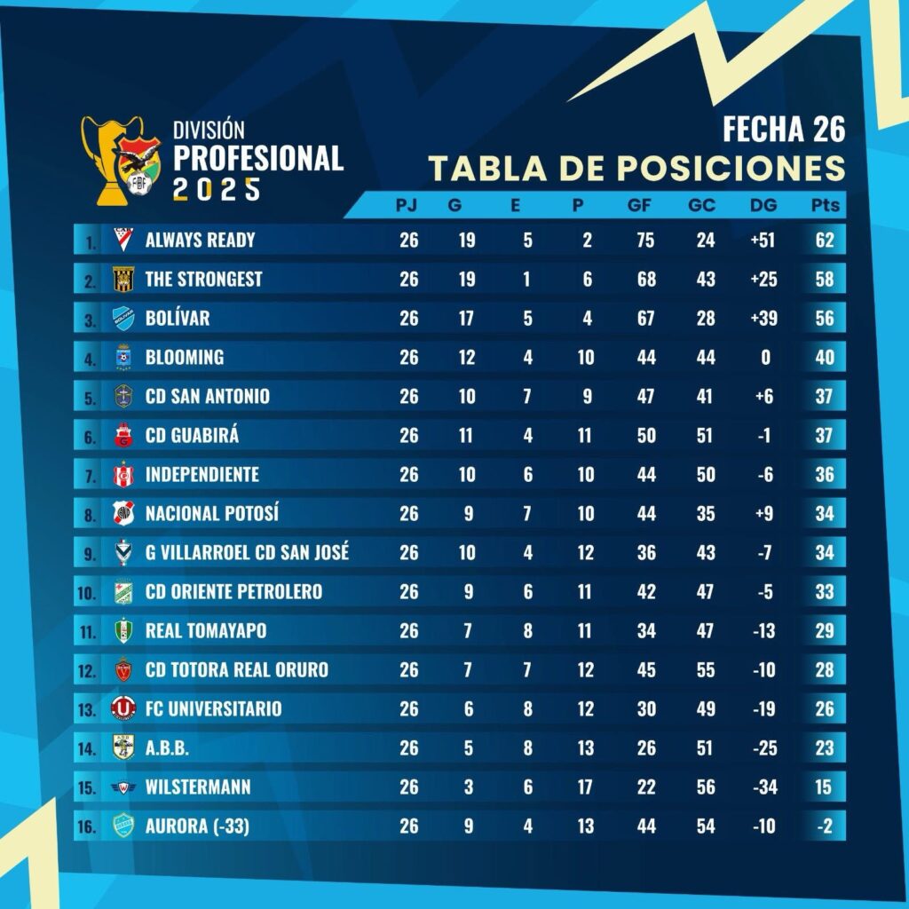 Se termino la fecha de «Clásicos», todos quedan con 26 partidos jugados, Always Ready mantiene su favoritismo a 4 puntos de The Strongest, y Bolívar se acomoda cerca , a dos de su tradicional rival.